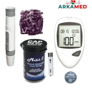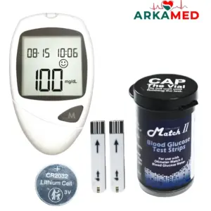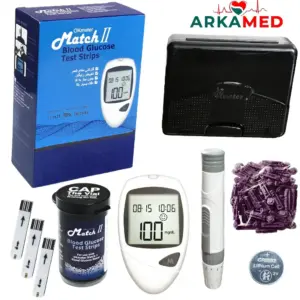 دستگاه تست قند خون مچ Match II با ۵۰ عدد نوار تست اتولانست، لانست و کیف مقاوم، مناسب برای افراد دیابتی و مراکز درمانی. دقت بالا، بدون نیاز به کدگذاری، و تأیید شده با استانداردهای جهانی.